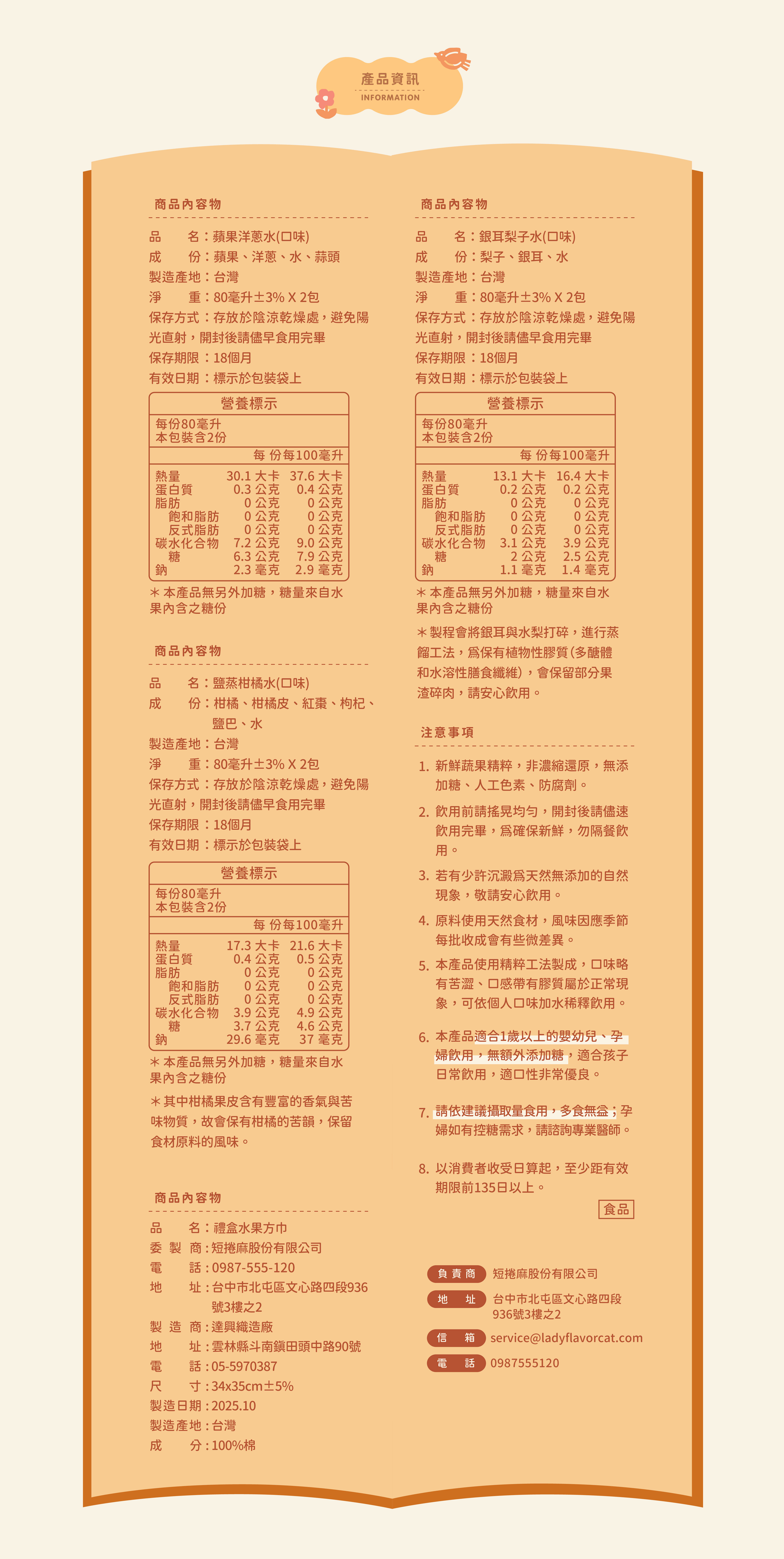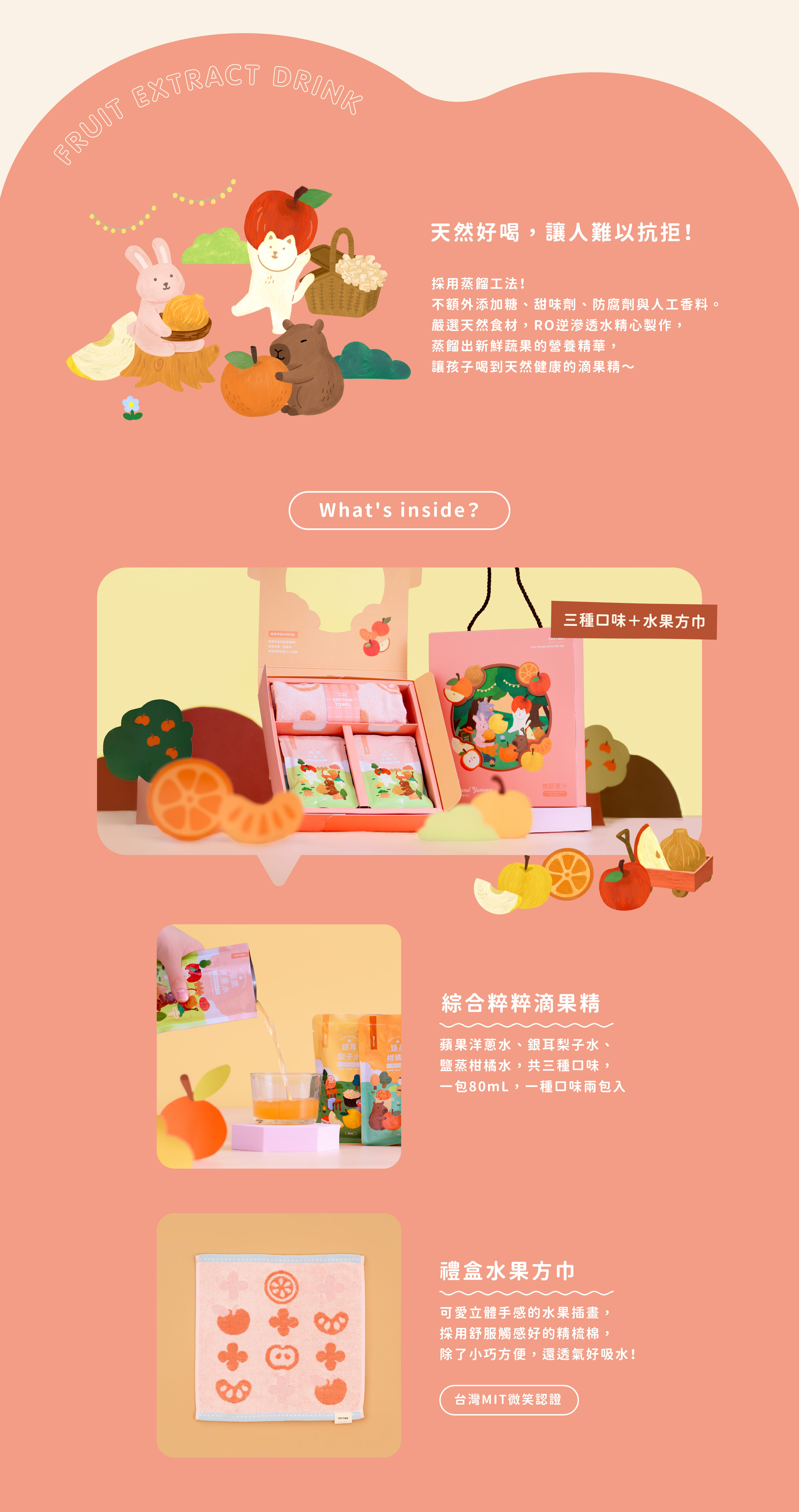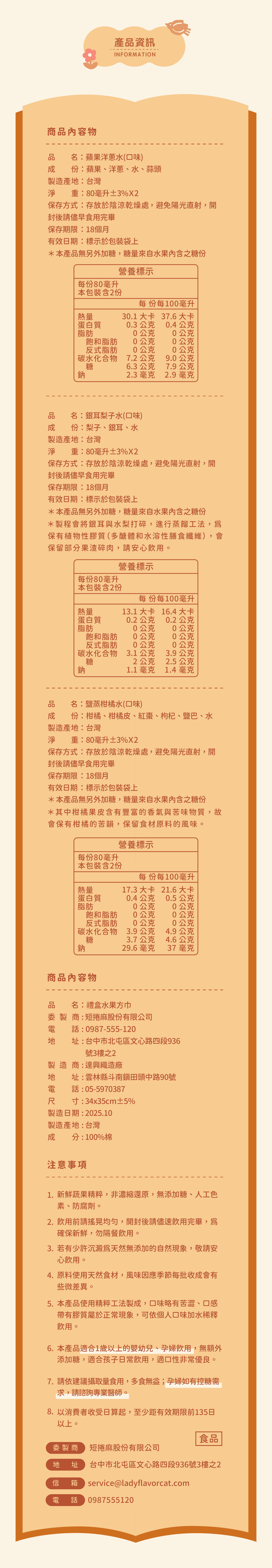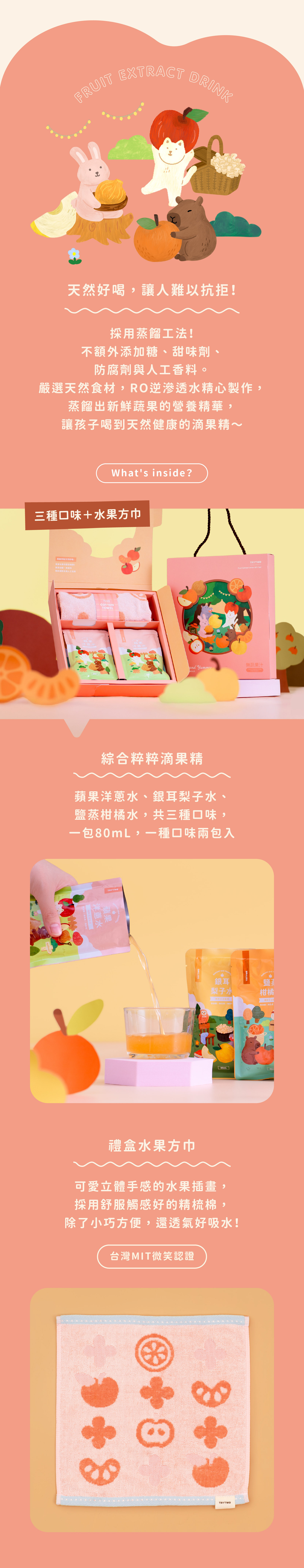 內容物:禮盒水果方巾*1條、蘋果洋蔥水(80ml)*2包、鹽蒸柑橘水(80ml)*2包、銀耳梨子水(80ml)*2包