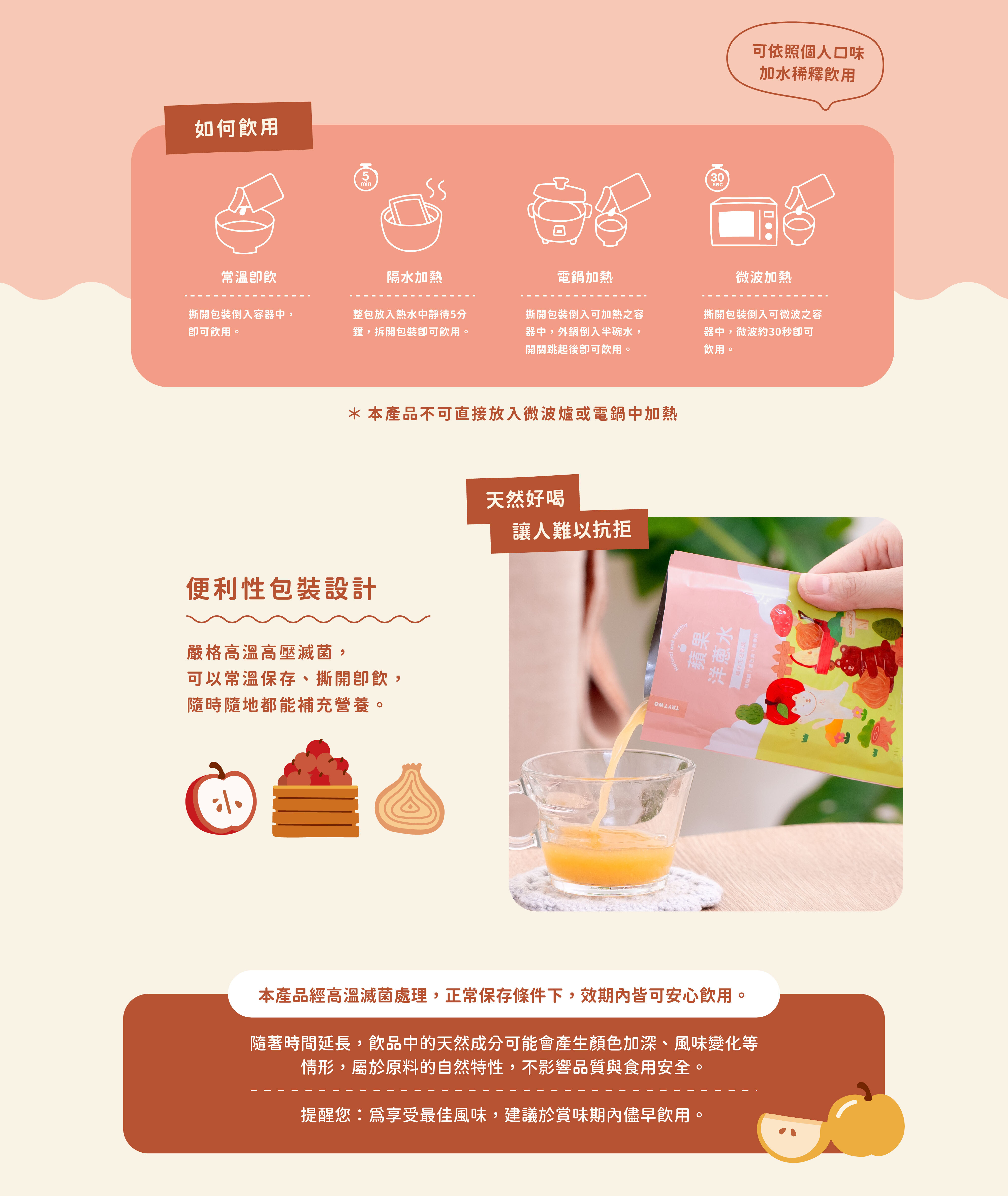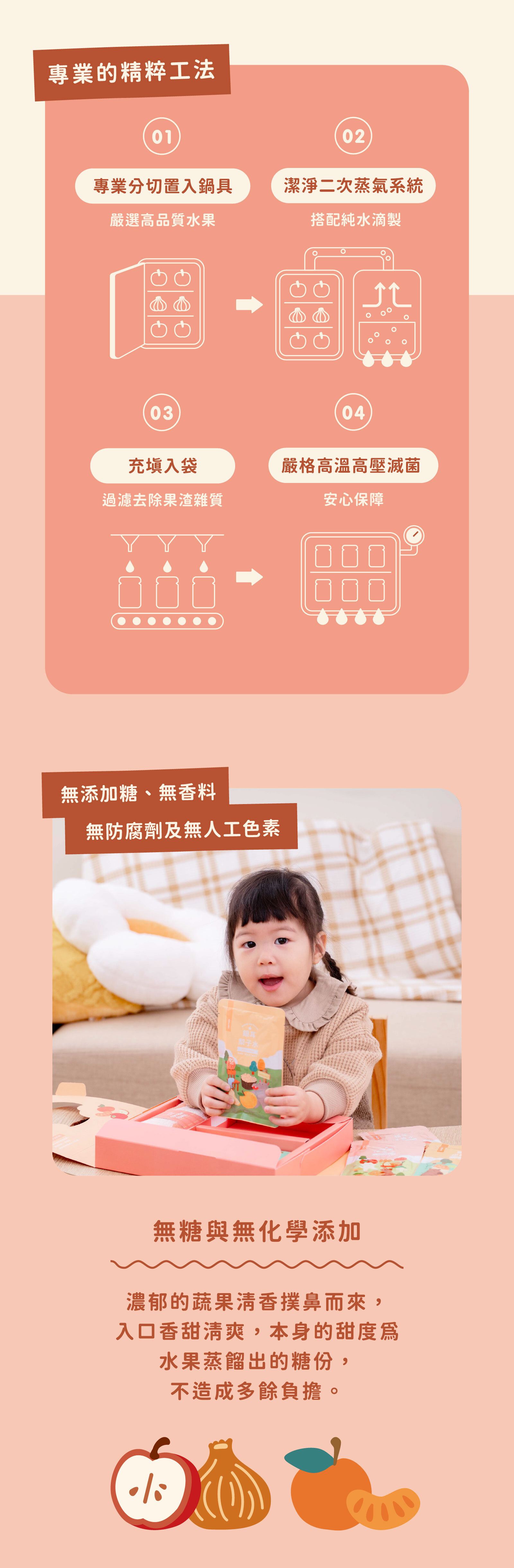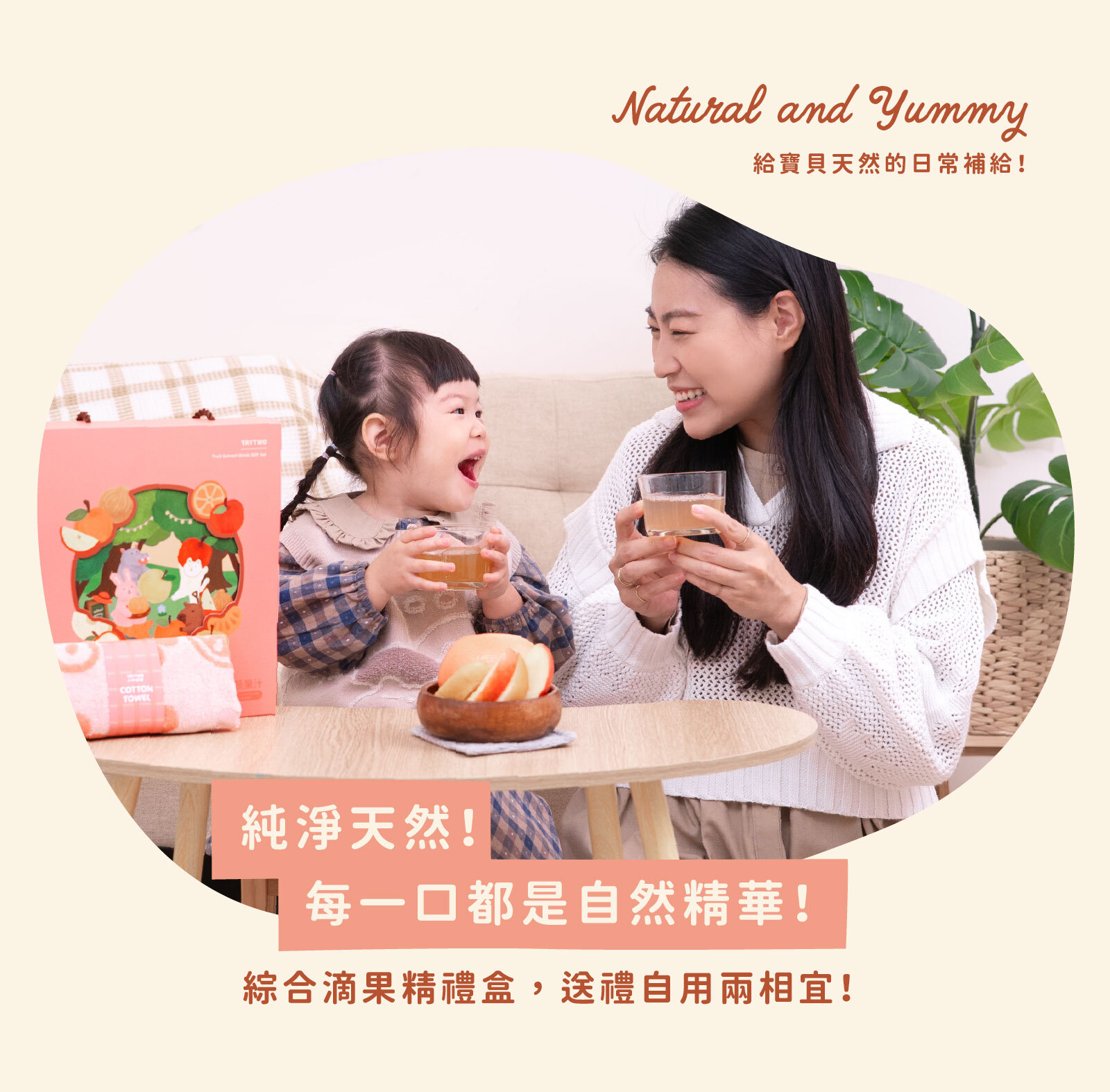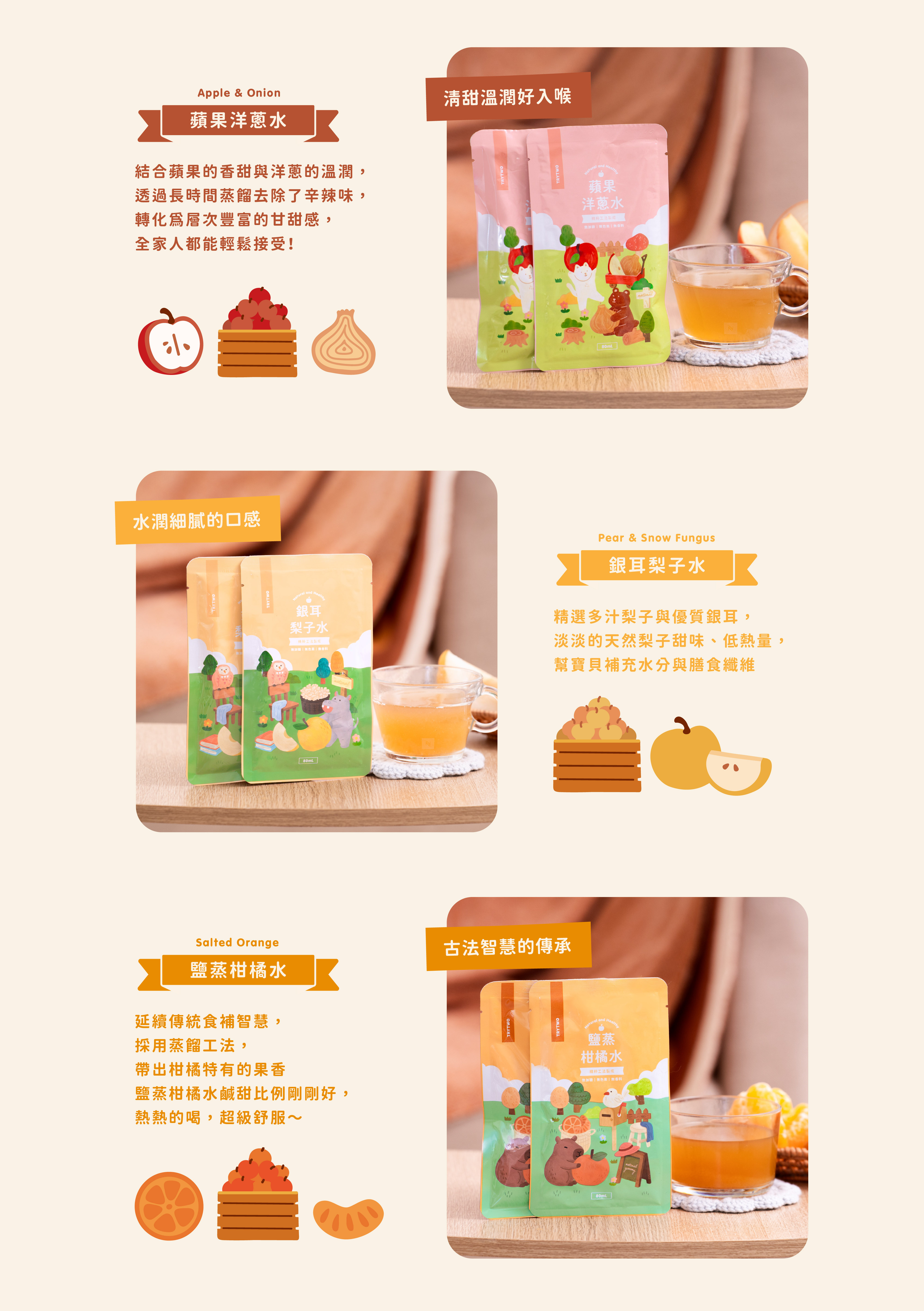 內容物:禮盒水果方巾*1條、蘋果洋蔥水(80ml)*2包、鹽蒸柑橘水(80ml)*2包、銀耳梨子水(80ml)*2包